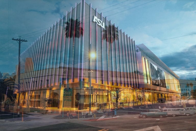 Echoes of Place is an experimental sound walk that invites visitors to explore the outside perimeter of the ASU MIX Center as a living archive. As you move, imagined soundscapes reveal layered histories: the irrigation networks of the Akimel O’odham (Pima) and Pee Posh (Maricopa) peoples; the agricultural and church-centered community of early Mormon settlers; the WWII hangar that later hosted the Maricopa County Fair; and the midcentury buzz of the El Portal Hotel, once home to a lively bar and Spring Training guests, including Chicago Cubs players. Each step acts like a query into these temporal fragments, echoing database-driven storytelling. Today, the MIX Center adds its own frequencies of film, game, and media creation. Through sound, Echoes of Place lets listeners drift through overlapping eras, experiencing downtown Mesa as an interactive field of memory where past and present resonate together.